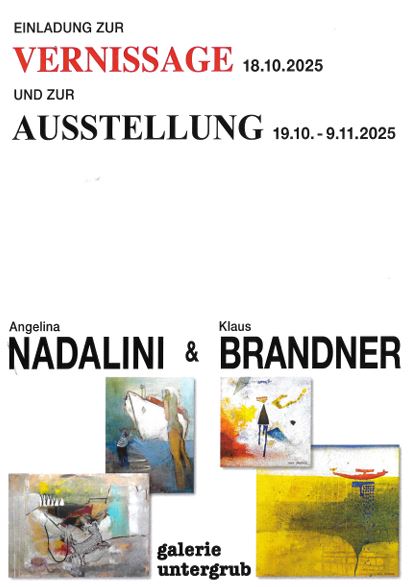 Wir erlauben uns, Sie und Ihre Freunde zur Eröffnung der Ausstellung Angelina NADALINI & Klaus BRANDNER am 18. Oktober 2025 ab 15 Uhr höflichst einzuladen.